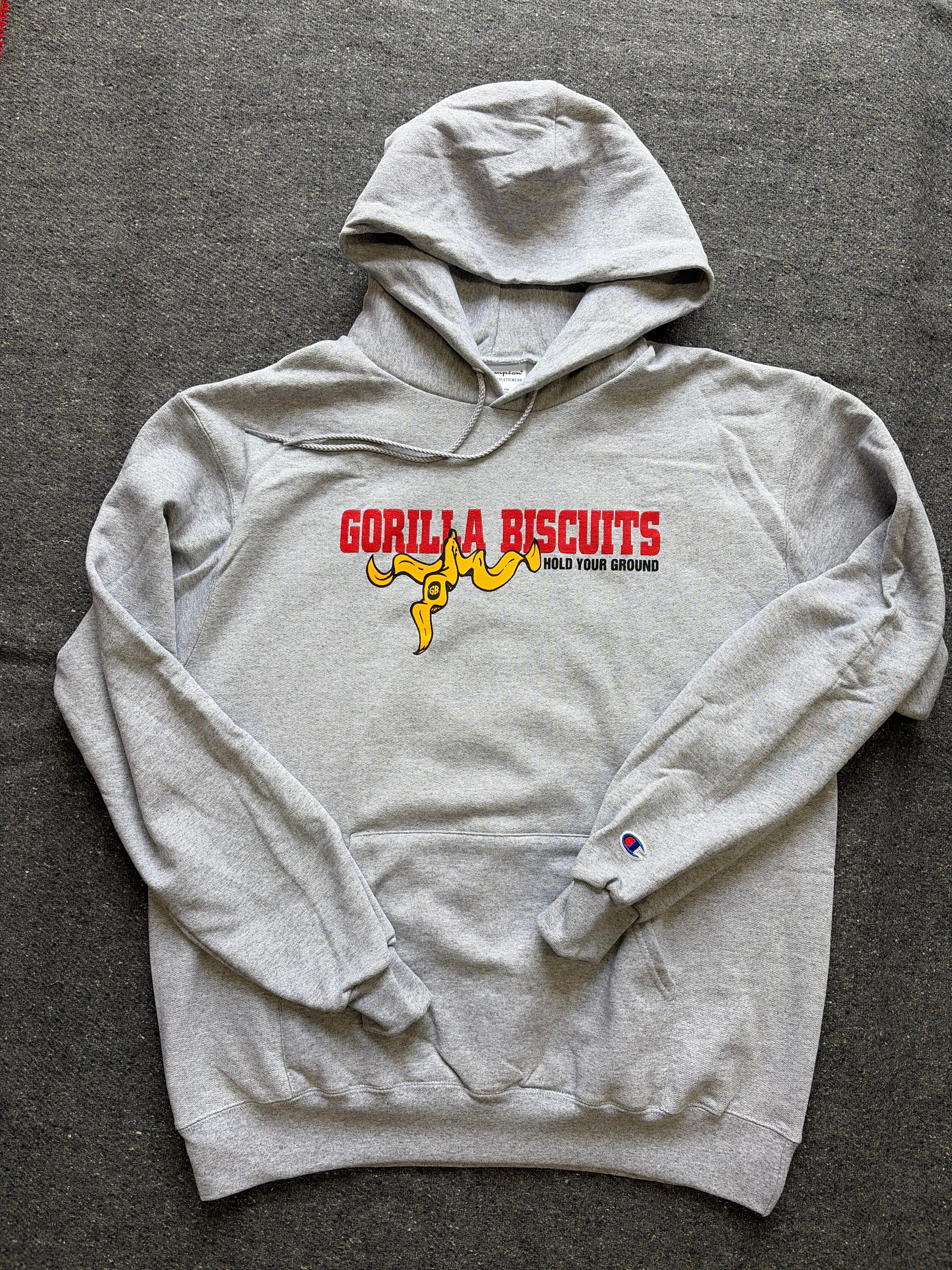 NYハードコアを象徴するGorilla Biscuitsの名作メッセージ “Hold Your Ground” を、グレーボディに落とし込んだフーディー。